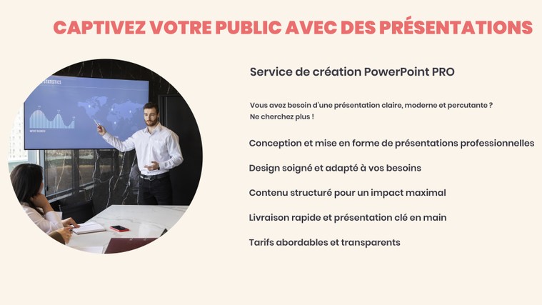 - Créativité et design : Je mets l'accent sur la conception visuelle pour garantir que votre présentation soit à la fois attrayante et efficace.