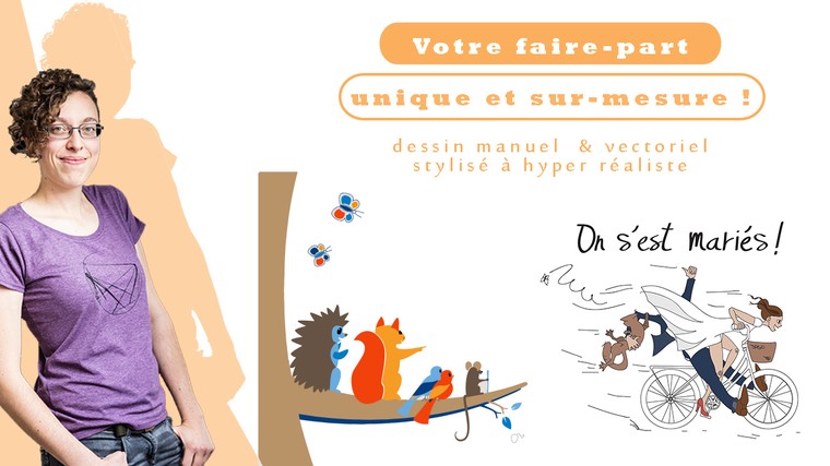 Bonjour ! Diplômée d'un Master en Illustration, je travaille depuis plus de 10 ans sur des projets allant du logo épuré au portrait, du minimaliste au (très) grand format, du rigolo au rigoureux. Faire-part, cartes postales, logo ou encore vêtements et mugs personnalisés, je suis un véritable couteau suisse... mais belge ! J'aime les projets décalés et les clients qui veulent se démarquer de la concurrence ou surprendre leurs proches. Si vous voulez une création toute faite, gratuite et sans personnalité, je vous conseille Canva. Si vous voulez une création sur-mesure réalisée par une professionnelle à votre écoute, ne cherchez plus, vous m'avez trouvée :) Tout commence par un dialogue pour préciser vos besoins et vos envies, le style souhaité, le format et les couleurs. Ensuite je vous ferai 2 propositions minimum. Vous choisissez ce que vous préférez et nous continuons le projet ainsi, vous avez toujours un droit de regard, aucune mauvaise surprise à la livraison.