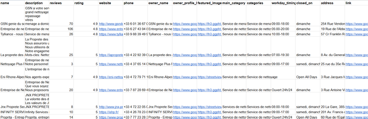 Vous obtiendrez un fichier Excel ou CSV propre et facile à utiliser, contenant pour chaque établissement trouvé (selon disponibilité sur Google Maps) :