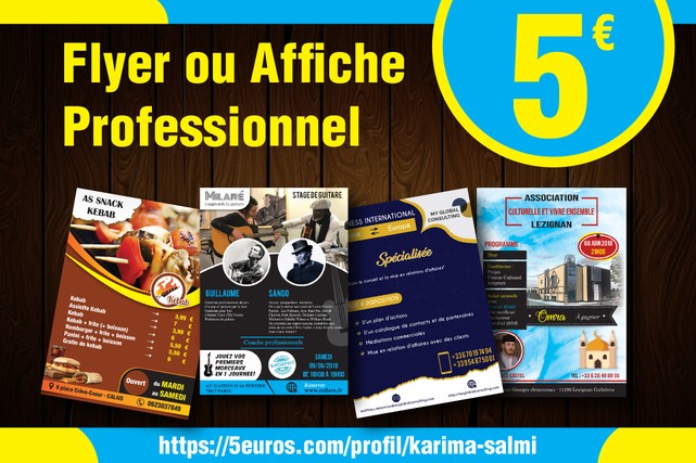 Je suis infographiste professionnelle avec une expérience de + 10 ans sur différents travaux graphiques ✔️+565 ventes au total ✔️+432 avis positifs Ma priorité est de vous satisfaire en proposant le meilleur de moi à chaque commande. Je mets mon expertise professionnelle à votre service.” Vous pouvez donc faire appel à moi pour la création de votre: III> logo III> Cartes de visites, III> Flyers, dépliants ou affiches III> Packaging III> Les différente format : Sliders, images des réseaux sociaux, images pour articles, encarts, bandeaux, habillages de page ( ou le format de votre choix ) Faites moi confiance, vous ne le regretterez pas. 100% satisfaction garantie Pour retrouver nos autres services proposés : https://5euros.com/profil/karima-salmi