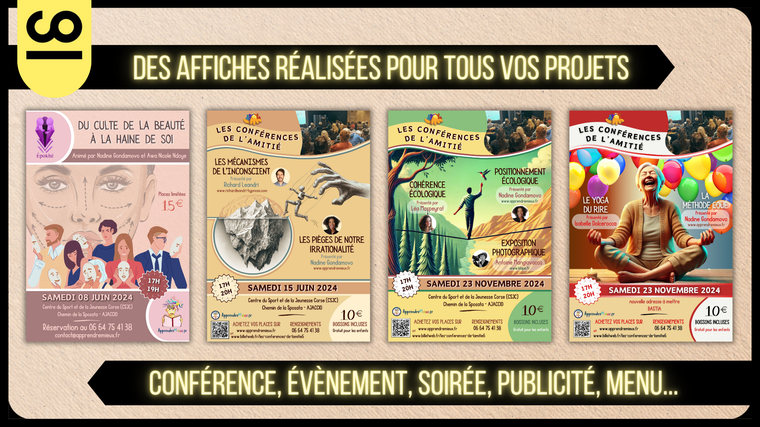 Mes affiches se distinguent par leur personnalisation totale, leur design de qualité et leur réalisation rapide. Parfaites pour tout type d'événement, elles sont conçues pour capter l'attention et laisser une impression durable.