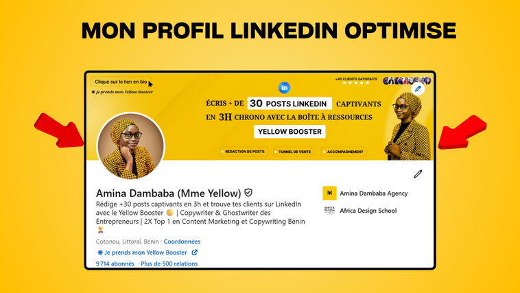 ✅️ +20000 abonnés sur LinkedIn & Facebook ✅️ +100% des clients satisfaits ✅️ +5000 contenus produits Je suis Amina Dambaba, copywriter et ghostwriter. Mes services s'adressent principalement aux entrepreneurs web. Je mets à votre disposition tout mon savoir-faire et mon expérience en création de contenus pour attirer vers vous des prospects qualifiés et augmenter votre visibilité sur Linkedin. Si vous recherchez une professionnelle en marketing digital capable de : Transformer votre profil LinkedIn en page de vente ; Rédiger et publier des publications sur vos réseaux sociaux ; Optimiser le contenu des pages de votre site web (texte + design) ; Rédiger et publier des articles de blog optimisés pour le SEO ; Créer une landing page pour générer des prospects qualifiés ; Rédiger vos e-mails pour convertir vos abonnés en clients ; Créer des tunnels de vente pour augmenter votre clientèle. Sachez que vous êtes à la bonne adresse ! Je suis toujours à l'écoute de vos besoins dans le but de proposer une offre adaptée à 100% à vos objectifs. Avez-vous une question ou préoccupation ? Cliquez sur le bouton "Contacter" en haut pour discuter de votre projet avec moi. Ensemble, nous travaillerons sur la stratégie parfaite pour activer votre présence en ligne et avoir plus de clients ! Je suis disponible 7j/7.
