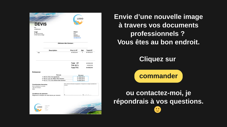 Je vous propose de créer des devis, factures et offres commerciales personnalisées qui mettront en valeur l'identité de votre entreprise :
