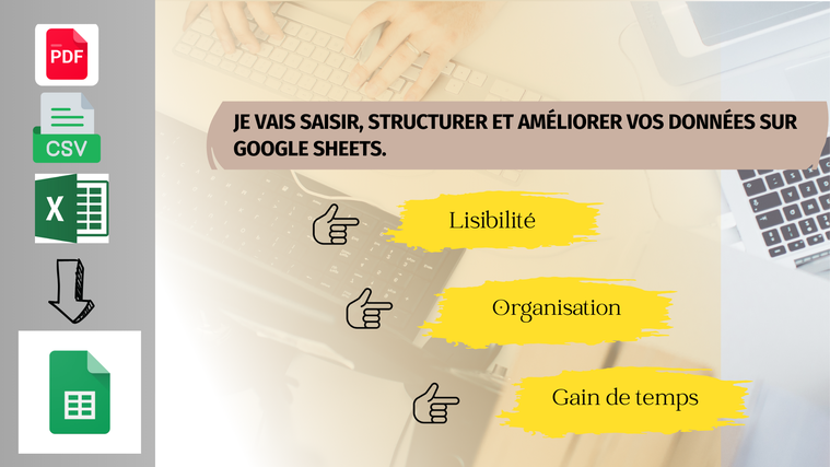 Fichiers Excel, CSV, et toute autre forme de données à convertir ou á saisir en Google Sheets.