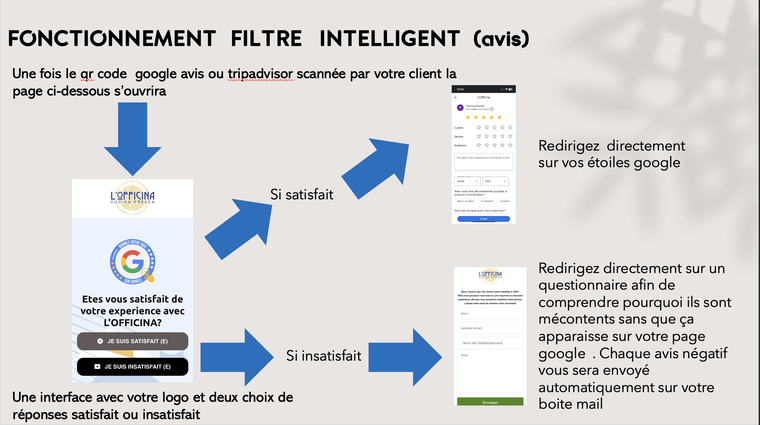 Le principe est extrêmement simple : je vais vous fournir un QR code personnalisé ( **GOOGLE** ou tripadvisor) que vous pourrez afficher ou envoyer ainsi qu’un lien que vous pourrez envoyer à vos clients. Ce lien redirigera directement vers notre filtre intelligent.