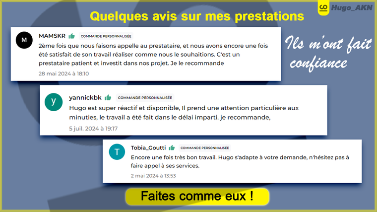 ⭐⭐⭐⭐⭐ ✅ + 100 Clients accompagnés et satisfaits sur comeup ✅ Vendeur vérifié sur Comeup 📞 Disponible 7j/7, n'hésitez pas à me contacter ! 💡 Salut ! Je suis Hugo, un graphiste professionnel, passionné par les conceptions graphiques, les montages et les retouches d'images et autres. J'accompagne les entrepreneurs, particuliers, les e-commercants et organismes dans l'accroissement de leurs visibilités en leur fournissant des visuels impactants et propres. Doté d'une bonne base en communication, je ne cesse d'augmenter la satisfaction de mes clients à travers des œuvres qui parlent. 🎨 Fort de plus de 620 projets réalisés (sur ComeUp et en dehors), aujourd'hui, je suis ravi de mettre à votre disposition mes compétences sur ComeUp. Je peux vous accompagner dans divers domaines du graphisme, notamment : Montage et la retouche d'image de toute sorte Conception d'image produit Conception d'image des catalogues moderne de toute sorte Conception de brochures et flyers professionnels. Conception de logos plus charte graphique complète, concevoir un favicon, etc. Et bien d'autres choses. Grâce à mes applications quotidiennes, j'ai développé une excellente maîtrise des logiciels phares de la suite Adobe, améliorant ainsi ma productivité et la qualité de mes services. 🎯 Mon objectif ici est de répondre aux besoins croissants des entrepreneurs, organismes, particuliers en quête de satisfaction en matière de conception graphique pour des projets et de la veille de leur présence en ligne. ✨ Travailler avec moi, c'est bénéficier d'un prestataire réactif, à l'écoute, soucieux du détail et compétent. Chaque mission reste pour moi une nouvelle opportunité de découverte et pour démontrer mon savoir-faire. 🤝 Je serais très honoré de contribuer au succès de votre projet et de vous compter parmi mes heureux clients. 📩 Contactez-moi pour discuter de la meilleure approche à tenir pour concrétiser vos projets. Ensemble, nous trouverons la solution créative qui répondra à vos objectifs. Au plaisir de vous satisfaire ! Cordialement, Hugo
