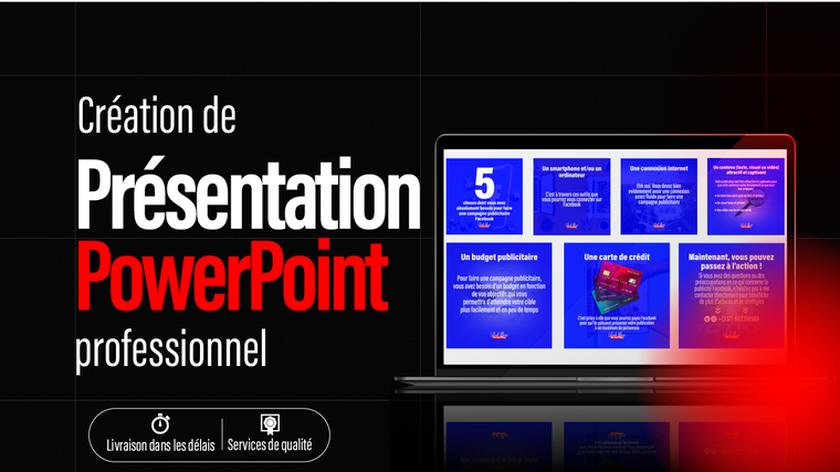 Je vais créer des présentations PowerPoint avec des diapositives impeccable ; je transforme vos idées en histoires captivantes, prêtes à captiver, persuader, et inspirer.