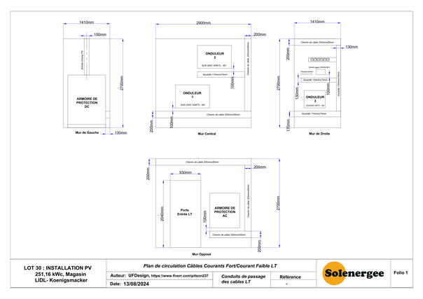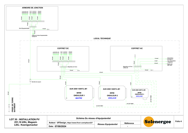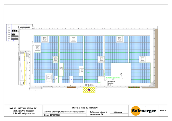 Projet N°3 (réalisé sur Fiverr en Juillet 2024) : Conception et réalisation des schémas et plans d'une centrale photovoltaïque de 251,16kWc connectée au réseau BT pour l'alimentation d'un magasin LIDL en construction dans la commune de KOENIGSMACKER.