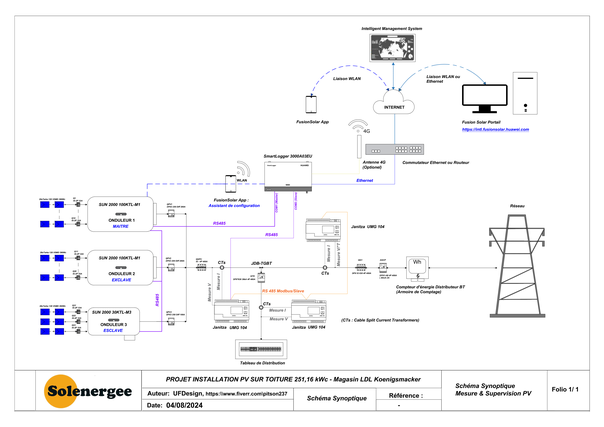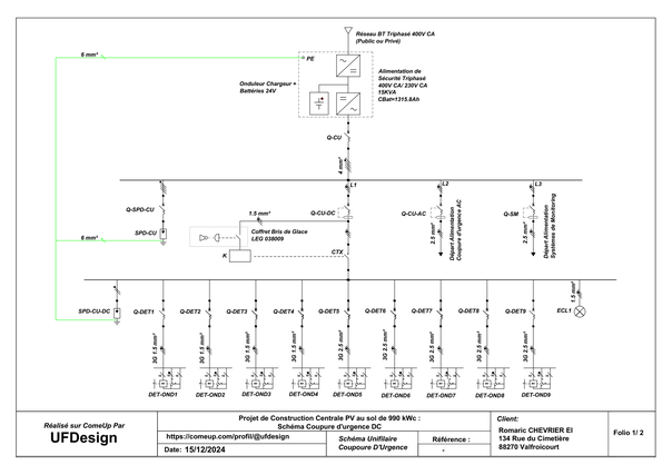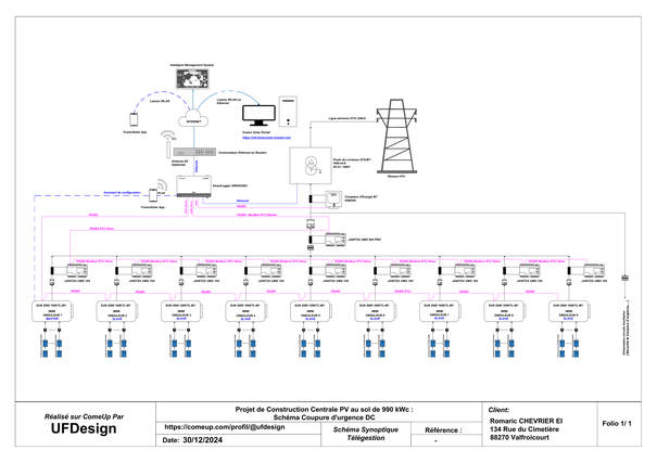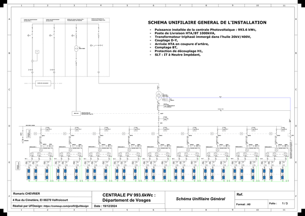Projet N°4 (réalisé sur ComeUp en Décembre 2024) : Conception Électrique et réalisation des schémas et plans d'une centrale solaire photovoltaïque de 990 kWc (STC) raccordée au réseau de distribution HTA dans la région de Vosges.