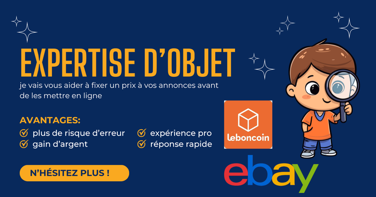 En me soumettant une description de votre article, je m'engage à vous transmettre rapidement un ordre de prix en fonction du marché ainsi qu'un conseil sur la marketplace la plus adaptée : ebay, le bon coin ou autre.