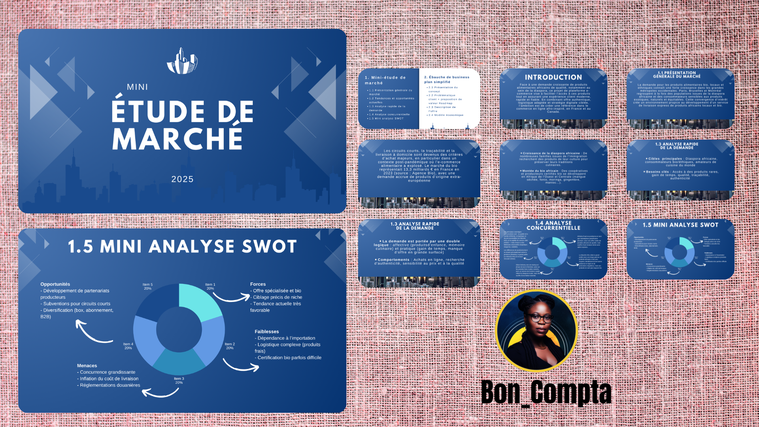 BON_COMPTA 🏅 ════════════════ Cabinet d’Expertise Comptable & Conseil en Stratégie Financière et Marchés Publics Excellence • Rigueur • Performance BON_COMPTA est un Cabinet d’Expertise Comptable & Conseil en Stratégie Financière et Marchés Publics dédié aux entrepreneurs ambitieux, startups, PME et dirigeants exigeants. Nous intervenons à l’intersection de la performance financière, de la structuration stratégique et de la conformité réglementaire, afin d’offrir à nos clients un pilotage maîtrisé et une croissance sécurisée. Notre mission est claire : Structurer votre entreprise avec précision, optimiser votre rentabilité et sécuriser votre développement. 🏛️ Notre cabinet repose sur trois piliers fondamentaux : ━━━━━━━━━━━━━━━━━━━━━━━━━ 🥇 Expertise Comptable & Gestion Fiscale 🥈 Stratégie Financière & Structuration d’Entreprise 🥉 Expertise en marché public/ Appel d'offre Cette complémentarité nous permet d’accompagner nos clients de la création d’entreprise jusqu’à la consolidation financière, en passant par la recherche de financement et l’accès aux marchés publics. Expertise Comptable & Gestion Financière ━━━━━ En tant que cabinet comptable, nous assurons une gestion rigoureuse et conforme aux normes en vigueur, tout en apportant une vision stratégique à vos chiffres. Nos prestations en expertise comptable : ══ Établissement du bilan comptable et du compte de résultat Télétransmission de la liasse fiscale Déclarations fiscales : TVA, IS, IR, CFE Tenue et révision comptable Situations intermédiaires Tableaux de bord de pilotage Optimisation fiscale Accompagnement en cas de contrôle fiscal Nous transformons vos obligations comptables en outils d’aide à la décision. Création & Structuration d’Entreprise ━━━━━ Créer une entreprise exige méthode et anticipation. Nous accompagnons les entrepreneurs dans : Le choix du statut juridique La structuration administrative et financière L’organisation stratégique du projet La mise en place d’outils de pilotage Notre objectif : sécuriser votre lancement et maximiser vos chances de réussite dès le départ. Business Plan & Prévisionnel Financier ━━━━━ Un business plan professionnel est un levier décisif pour convaincre banques, investisseurs et institutions. Nous concevons : ✔ Business Plan Premium Rédaction stratégique complète Argumentaire financier solide Synthèse exécutive percutante Design professionnel Pitch deck inclus ✔ Prévisionnel Financier Compte de résultat prévisionnel (3 à 5 ans) Bilan prévisionnel Plan de trésorerie Seuil de rentabilité Hypothèses détaillées Fichier Excel automatisé Nos documents répondent aux exigences des banques, investisseurs, incubateurs et organismes publics. Demande de Financement & Levée de Fonds ━━━━━ Obtenir un financement nécessite un dossier structuré et crédible. Nous vous accompagnons dans : Montage de dossier bancaire Demande de financement Bpifrance Préparation investisseurs Structuration du pitch Assistance aux comités décisionnels Nous maximisons vos probabilités d’obtention de financement grâce à une approche méthodique et stratégique. Marchés Publics & Appels d’Offres ━━━━━ BON_COMPTA est spécialisé dans l’accompagnement aux marchés publics. Nous intervenons sur : Veille et sourcing d’appels d’offres Analyse des DCE Rédaction des mémoires techniques Constitution des dossiers administratifs (DC1, DC2…) Stratégie de réponse Conformité réglementaire Notre expertise augmente significativement vos chances de remporter des contrats publics. Étude de Marché & Stratégie Marketing ━━━━━ Une décision stratégique doit reposer sur des données fiables. Nous réalisons : Étude de marché complète Analyse concurrentielle Benchmark sectoriel Définition de la proposition de valeur Plan marketing stratégique Stratégies digitales et tunnels de conversion Pourquoi Choisir BON_COMPTA ? ━━━━━ ✔ Cabinet à taille humaine, approche premium ✔ Plus de 100 projets accompagnés avec succès ✔ Expertise multi-sectorielle : commerce, services, tech, industrie, artisanat ✔ Confidentialité et rigueur absolue ✔ Vision stratégique orientée performance Nous ne sommes pas un simple cabinet. Nous sommes un partenaire stratégique engagé dans votre croissance. Notre Positionnement ━━━━━ BON_COMPTA s’adresse aux dirigeants qui recherchent : Un cabinet d’expertise comptable haut de gamme Un accompagnement stratégique structurant Des livrables irréprochables Une vision long terme Rendez-vous Stratégique Offert Vous souhaitez : Structurer votre entreprise ? Optimiser votre fiscalité ? Obtenir un financement ? Répondre à un marché public ? Construire un business plan solide ? Nous vous proposons un audit stratégique de 30 minutes offert.