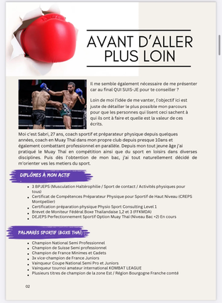 Je suis Sabri, coach de Muay thaï, coach sportif / préparateur physique spécialisé dans les sports de combat et ancien combattant pro en Muay Thaï également. Après avoir pris en charge pendant de nombreuses années des combattants sur l'aspect technique et physique, et m'être également former avec de nombreux diplômes et nombreuses formations, j'ai pu acquérir un savoir et une méthodologie efficace permettant de développer la puissance de frappe et l'explosivité. Et c'est dans cet ebook que je vous propose de découvrir ce qu'il faut savoir pour passer un cap dans vos capacités physiques !