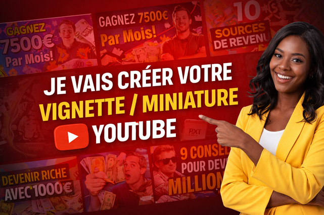 Je suis là pour vous aider à créer des vignettes YouTube accrocheuses et professionnelles, adaptées à vos besoins. Une vignette bien conçue est essentielle pour améliorer votre taux de clics (CTR) et attirer plus de vues sur vos vidéos.
