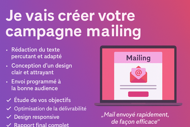 Je vous propose un service complet de création de campagne mailing sur-mesure, allant de la conception du contenu à l’optimisation pour l'envoi.
