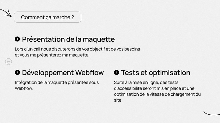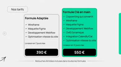Je vous accompagne dans l’intégration complète de votre maquette Figma sur Webflow, en respectant les détails du design et en veillant à la cohérence de votre image de marque. Vous pourrez choisir parmi trois formules pour répondre à vos besoins