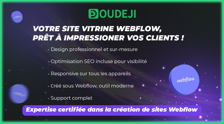 Ne laissez pas passer cette opportunité d'avoir un site vitrine professionnel avec Webflow, conçu par des experts de Doudeji. Contactez-nous pour toute question ou demande d'offre personnalisée. *Votre réussite commence ici. *