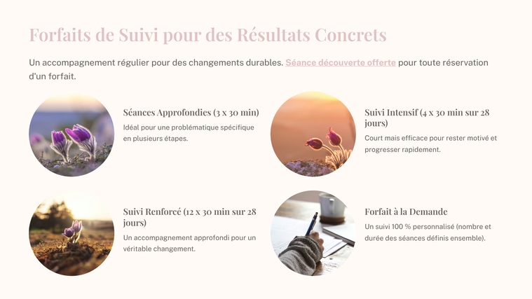 Suivi renforcé sur 28 jours (12 séances de 30 min) – Un accompagnement plus approfondi pour un véritable changement en profondeur.