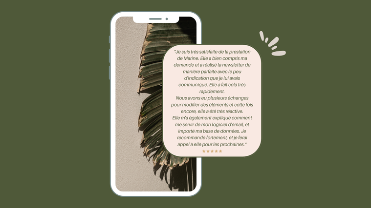 Je suis très satisfaite de la prestation de Marine. Elle a bien compris ma demande et a réalisé la newsletter de manière parfaite avec le peu d'indication que je lui avais communiqué. Ella a fait cela très rapidement. Nous avons eu plusieurs échanges pour modifier des éléments et cette fois encore, elle a été très réactive. Elle m'a également expliqué comment me servir de mon logiciel d'email, et importé ma base de donnée. Je recommande fortement, et je ferai appel à elle pour les prochaines.