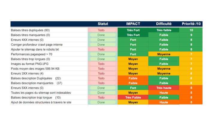 Non, l’audit identifie et met en évidence les zones à améliorer sur votre site, mais il ne corrige pas les problèmes directement. Le rapport d’audit inclut une liste de tâches dans un Google Sheets, avec des actions à mettre en œuvre pour corriger les erreurs et améliorer les performances techniques. Vous recevrez également des explications et des recommandations sur les actions à entreprendre, mais c’est à vous de les appliquer, ou avec l’aide de votre développeur.