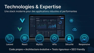 Votre site sera développé avec Laravel, accompagné de technologies modernes comme HTML, CSS, JavaScript, et JQuery. Avec Laravel, je vous développe un site web clé en main. Je vous offre un site fiable, sur mesure, et évolutif, parfaitement adapté à votre activité et conçu pour durer.
