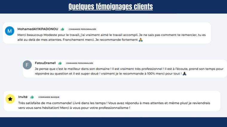 “Merci beaucoup Modeste pour le travail, j'ai vraiment aimé le travail accompli. Je ne sais pas comment te remercier, tu es allé au delà de mes attentes. Franchement merci. Je recommande fortement 🙏”