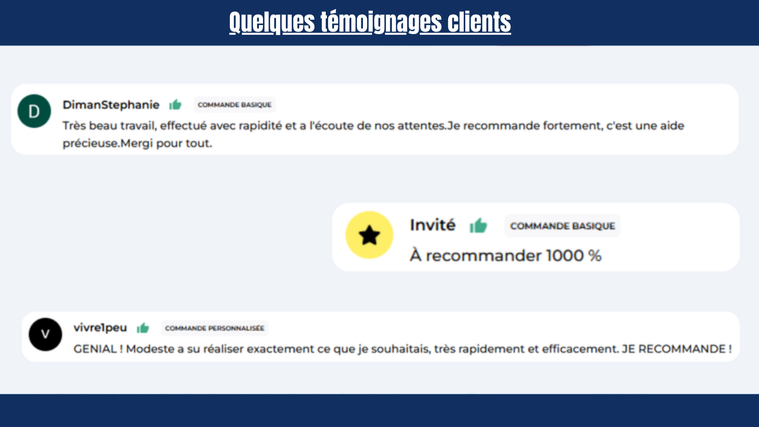“Au top du top ! Qualité, efficacité et rapidité : tout y est. Toujours disponible, réactif et à l’écoute. Un vrai professionnel, humain et impliqué. Merci Modeste pour ton excellent travail. Je n’hésiterai pas à te solliciter pour de futurs projets. Prends soin de toi.”