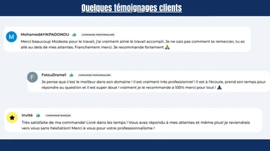 “Merci beaucoup Modeste pour le travail, j'ai vraiment aimé le travail accompli. Je ne sais pas comment te remercier, tu es allé au delà de mes attentes. Franchement merci. Je recommande fortement 🙏”
