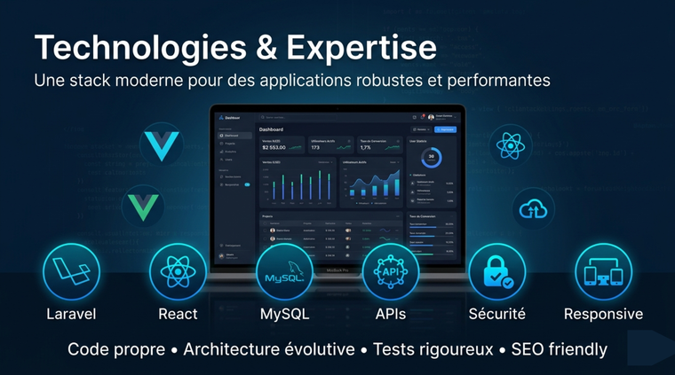- Maîtrise des technologies modernes : Laravel (back-end), Vue.js / React (front-end), PHP, MySQL, JavaScript, etc.