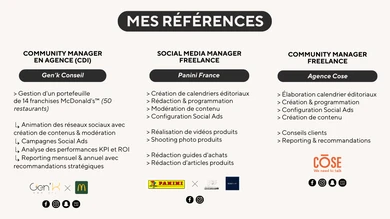 🚀 Développez votre activité avec une stratégie Social Media performante ! Bonjour ! Moi, c’est Lucas, Social Media Manager avec plus de 8 ans d’expérience, dont 3 ans passés en agence de communication. Fort de cette expérience, j’ai eu l’opportunité de piloter la communication de 14 franchises McDonald’s™, couvrant ainsi 52 restaurants à travers la France. Pourquoi me faire confiance ? 👉 Un accompagnement sur-mesure et une implication totale : si la créativité, la disponibilité, la proximité et l'écoute sont des aspects que vous recherchez chez vos partenaires, nous sommes faits pour travailler ensemble ! 👉 Une maîtrise complète de l’écosystème social media : de la gestion de Facebook, Instagram et LinkedIn à la publicité sur Snapchat, Waze ou encore TikTok, je sais comment faire briller votre marque. Si vous souhaitez développer votre activité grâce aux réseaux sociaux, je serais ravi de vous accompagner. Ensemble, donnons à votre marque l’impact qu’elle mérite !