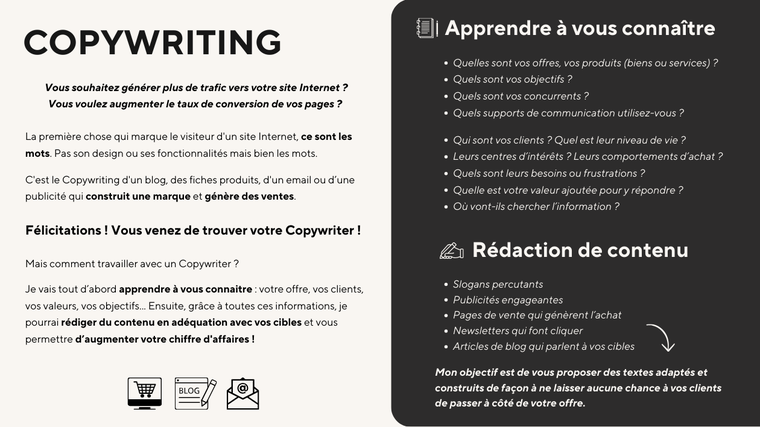 **Le copywriting**, c’est l’ingrédient magique qui vous permet de raconter l’histoire de votre marque, de valoriser votre offre et de transformer de simples visiteurs en clients fidèles.