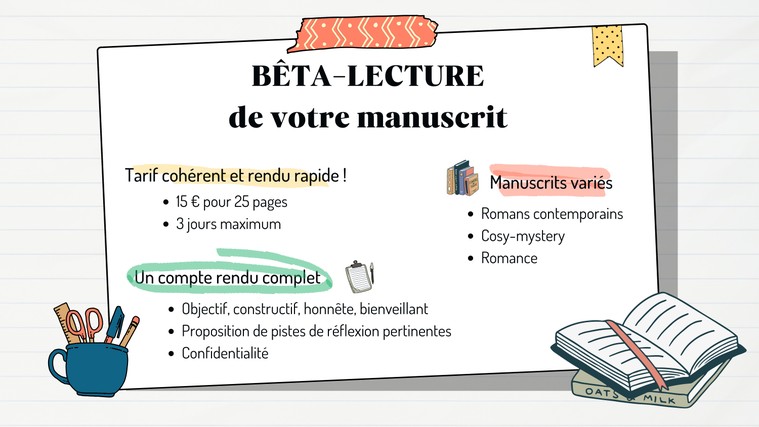 Passionnée par la lecture et l'écriture depuis ma plus tendre enfance, je vous propose de réaliser la bêta-lecture de votre manuscrit. Lectrice éclectique, je vous apporterais un r les cosy mystery, les romances et la littérature anglaise du 18-19ème siècle.