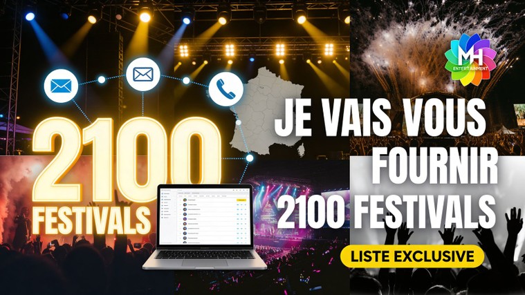 Je vais vous fournir une liste exclusive de 2100 festivals en France avec toutes leurs coordonnées