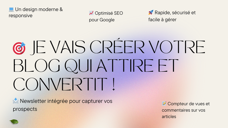 Je vous propose la création d’un blog professionnel et performant, conçu pour vous offrir une expérience utilisateur fluide, une gestion simplifiée et une visibilité optimisée sur Google.