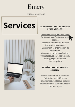 Optimisez votre temps et boostez votre productivité : des tâches chronophages réalisées et plus d'opportunités pour vous concentrer sur votre activité. Je suis Baya, une assistante virtuelle polyvalente. —Pourquoi faire appel à mes services ? Pour vous aider dans le traitement et dans la réalisation des micro-tâches qui sont importantes et contribuent au bon fonctionnement de votre entreprise et de vos projets, mais qui vous font perdre un temps précieux auquel vous pourriez le mettre sur votre activité —Qu'est-ce que vous y gagnez ? Une collaboration flexible et engagée, à l’écoute de vos besoins. Un gain de temps significatif : jusqu’à 2 heures par jour retrouvées pour vous concentrer sur vos priorités. Une organisation optimale pour améliorer l’efficacité de vos projets. Mes services : ADMINISTRATIONS ET GESTION PERSONNELLES : Gestion et classement des mails Gestion et planification de votre agenda Saisie des données et mise en forme des documents Classement et organisation de documents Compte-rendu de vos réunions virtuelles (avec enregistrement) , témoignages, vos vidéos (transcription) MODÉRATION DES RÉSEAUX SOCIAUX : modération des interactions et l'adhésion sur différentes plateformes de réseaux sociaux Modération des commentaires et des messages Réponse aux demandes client via les réseaux sociaux. Maitrise des outils : Pack office : Excel, Word, PowerPoint, Outlook Outil collaboratif : Suit Google (Docs, Sheets, Drive, etc.). Canva Outils de gestion : Notion Prêt à déléguer et à gagner du temps ? Contactez-moi dès maintenant Moyen de communication : Passionnée par l'organisation et la gestion de diverses tâches, je privilégie les échanges écrits pour assurer une communication claire et réfléchie dans nos échanges. Cela me permet de structurer mes idées efficacement tout en optimisant le suivi des tâches et des projets. Assistante virtuelle/adjointe virtuelle/gestion de la communauté