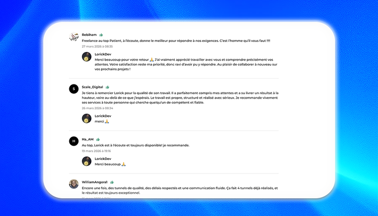 | Très bon professionnalisme avec dès le départ, explications claires et grande patience tout au long du projet. Les délais annoncés ont été respectés et les ajustements demandés ont été pris en compte sans difficulté. Résultat : Livrable conforme aux attentes, avec une réelle attention portée aux détails et à la qualité finale. Service client / communication : Échanges fluides, réponses rapides et attitude toujours courtoise. Verdict : ★★★★★ — Une collaboration efficace et agréable, que je recommande sans hésiter. Merci LorickDev |
