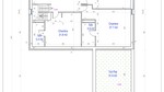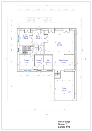 Un plan d’étage 2D d'un projet inférieur à 50m2 au format JPEG, PNG ou PDF avec côtes et dimensions, murs , cloisons et menuiseries.