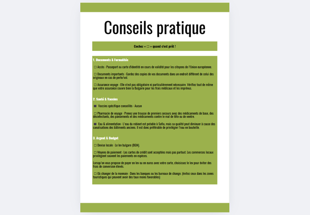 - 3 pages de conseils pratiques pour votre voyage (transport, budget, coutumes …)