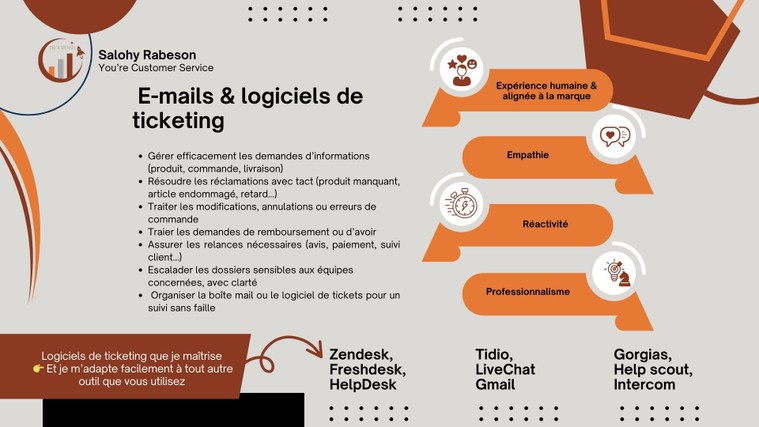 Je gère les demandes avec une approche humaine et stratégique, dans le respect de votre ton de marque, en apportant des solutions concrètes et un vrai soulagement à vos clients que ce soit par email, chat en ligne ou sur des plateformes telles que Gorgias, Zendesk, Freshdesk, Intercom, Tidio, ou autre, je maîtrise ces outils et je m'adapte rapidement à de nouveaux outils.