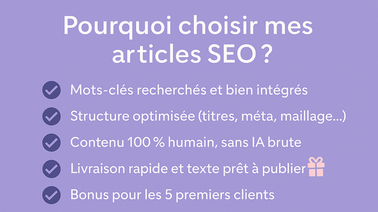 ~** OFFRE DE LANCEMENT**~ : Pour les 5 premiers clients, j’offre un mini-audit SEO gratuit ou **300 mots supplémentaires offerts** sur votre première commande. Faites vite !