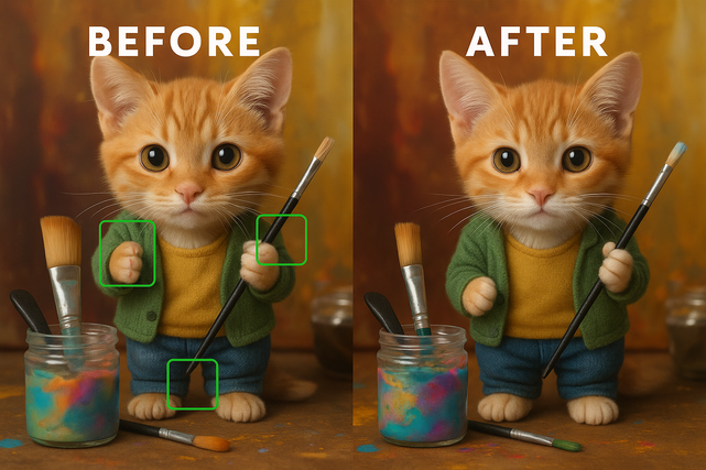 Je prends soin de vos images : correction des défauts (mains, visages, détails maladroits), ajustement des couleurs, suppression ou ajout d’éléments, modification de fond, correction de texte, montée en qualité (upscaling)...