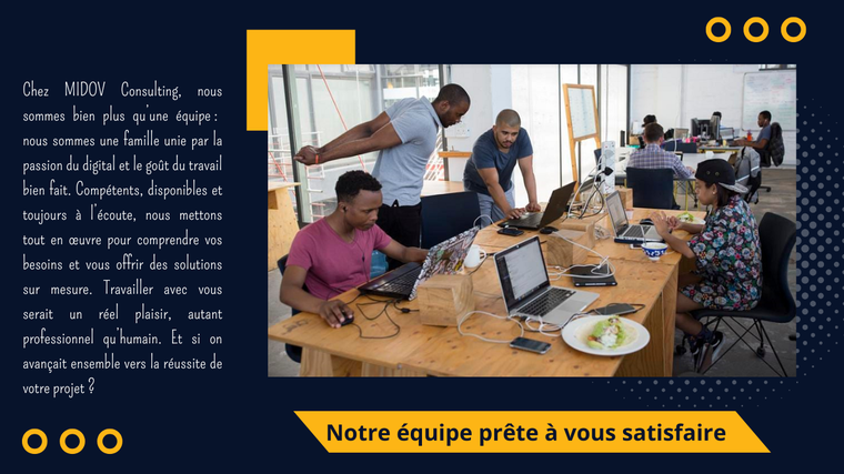 Chez MIDOV Consulting, nous partageons tous les mêmes valeurs : professionnalisme, innovation et satisfaction client. Ensemble, nous donnons vie à vos ambitions digitales.