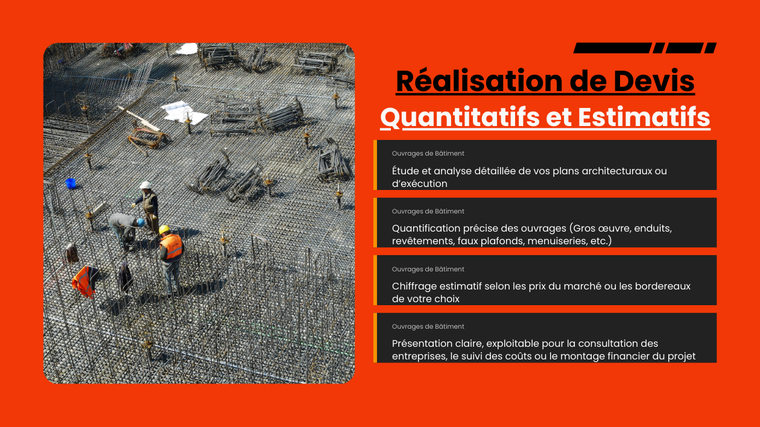 Grâce à mon expertise en métrés et en chiffrage d’ouvrages de bâtiment, je vous propose un service professionnel de réalisation de devis quantitatifs et estimatifs complets, conformes aux normes en vigueur dans le secteur du BTP.