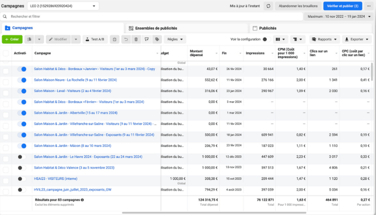 Lancement de 14 campagnes Facebook Ads (5 pour tester et 10 pour obtenir des résultats concrets)