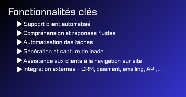 Je vous propose un assistant virtuel conçu pour automatiser les réponses aux questions fréquentes, capter des leads, améliorer l’expérience client et libérer du temps à votre équipe.