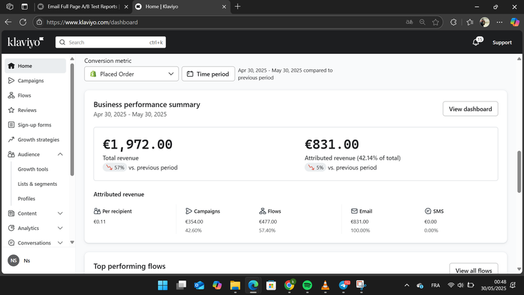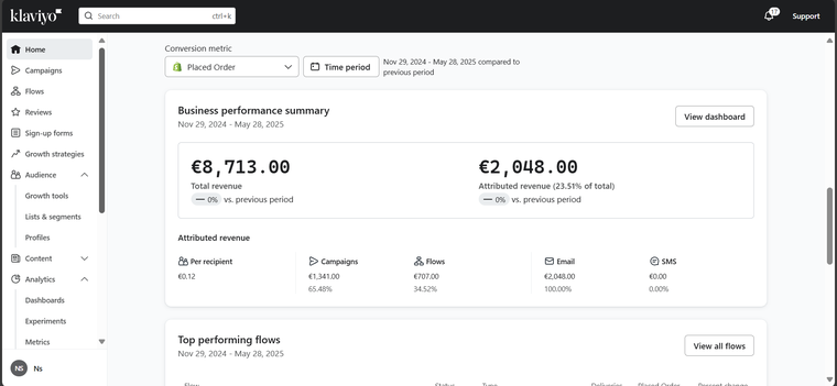 Pas d’automatisation **Flows actifs 24h/24, 7j/7** avec Klaviyo