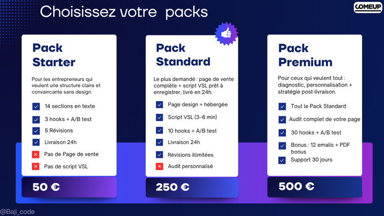 **Le plus demandé : page complète + script VSL prêt à enregistrer, livré en 24h.**