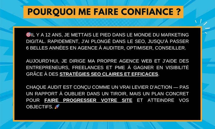 Disponible pour toute question en amont — je vous réponds rapidement et avec clarté. Je peux également vous accompagner dans la mise en œuvre des actions, comme la création de contenus optimisés par exemple.
