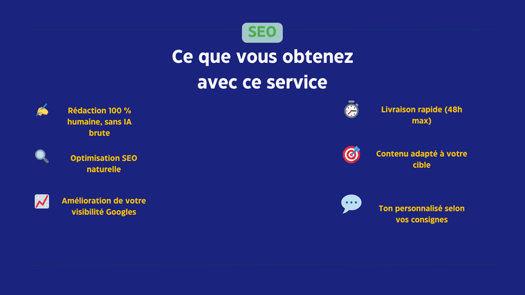 Je vous propose des articles clairs, engageants et stratégiquement pensés pour séduire Google… sans jamais sacrifier l’expérience de vos lecteurs.