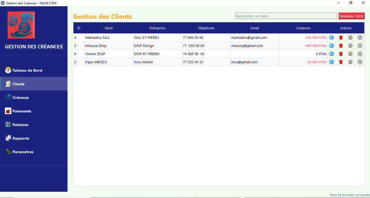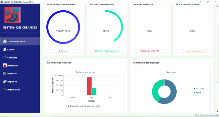 L'interface utilisateur a été conçue pour la simplicité. Fenêtre principale avec navigation intuitive, formulaires de saisie avec validation automatique des données, tableaux de données avec fonctions de tri et de recherche avancée, système d'alertes visuelles pour les échéances critiques, graphiques interactifs pour visualiser vos performances de recouvrement. Aucune formation technique n'est nécessaire : si vous savez utiliser un ordinateur, vous maîtriserez ce logiciel.
