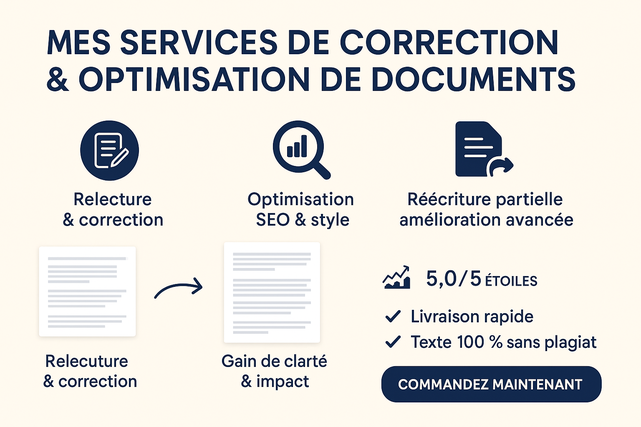 Aujourd'hui, je mets mes compétences à votre service pour transformer vos documents en outils clairs, convaincants et prêts à être utilisés auprès de vos clients ou partenaires. Mon approche est simple : je respecte votre ton, clarifie vos idées et optimise vos textes pour un impact maximal.